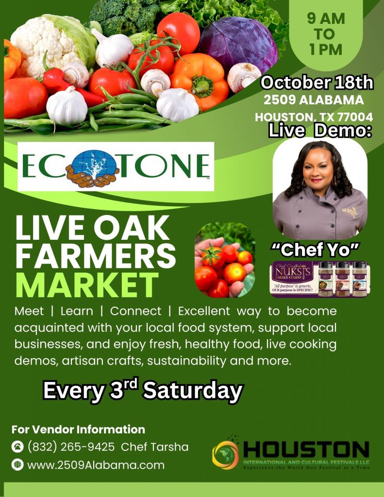 We are SUPER excited to launch our Live Oak Farmers Market in Third Ward, Houston, TX only one block away from our home community garden and orchard at St. Charles Street Urban Community Garden & Orchard. The LOF Market will kick-off at 2509 Alabama, Houston, TX 77004 on October 18, 2025 from 9:00 am to 1:00 pm and continue every third Saturday of the month.